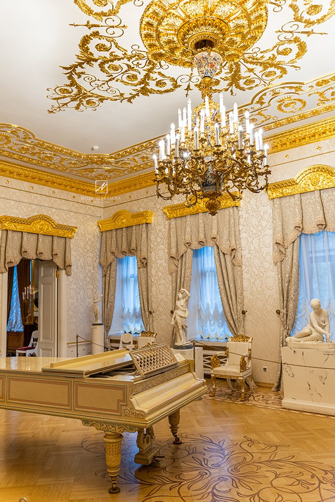 Во дворце сохранились интерьеры, которые поражают и сегодня: Белая, Золотая, Этрусская, Малиновая, Лепная гостиные и другие залы. Здесь проходили балы, концерты, вечера, и дворец становился центром культурной жизни Петербурга.